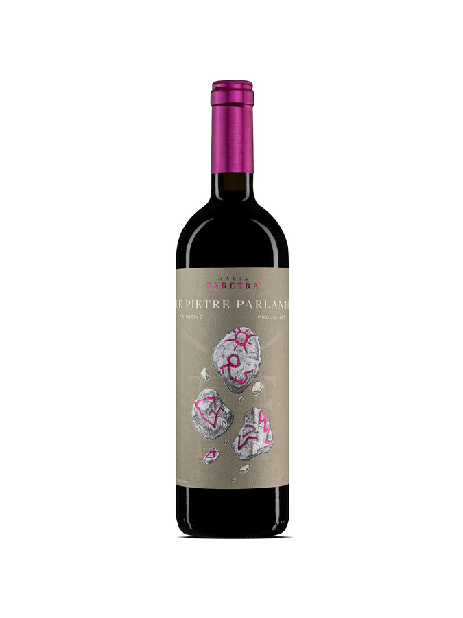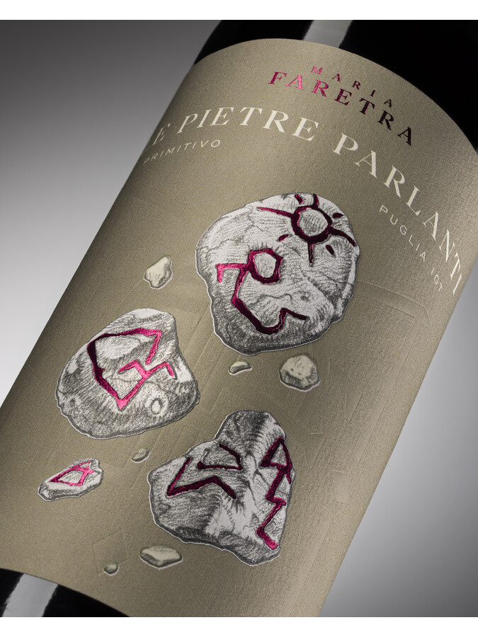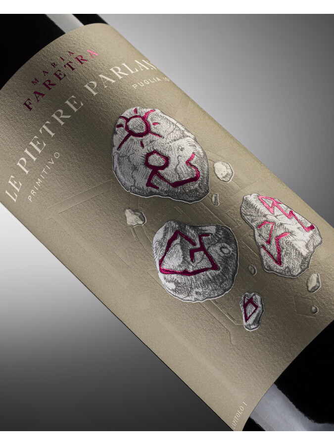 Le Pietre Parlanti trae ispirazione dalla terra che dà origine a questo Primitivo di pregio. Suoli calcarei dove la roccia madre si rivela facilmente, senza andare in profondità. Una conformazione che in passato aveva relegato quest’area alla pastorizia, prima che la frantumazione meccanica aprisse nuove opportunità nella viticoltura. Nonostante il lavoro inesauribile di grandi macchinari, l’anima della Capitanata continua a emergere, con i massi che affiorano costantemente, come se volessero raccontare la propria storia. La terra vuole esprimersi e queste sono pietre parlanti. Nel label design, che combina elementi in rilievo e tratti artistici, si compone un’immagine dinamica e vitale, arricchita da simboli runici che evocano gli elementi primordiali: sole, terra, acqua, fuoco e aria.